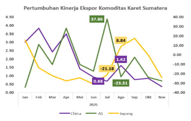 Karet sebagai salah satu komoditas ekspor utama Sumatera, membutuhkan dukungan dalam menjaga daya saing di tengah persaingan global. Daya saing ekspor karet sangat tergantung dari hasil negosiasi tarif 0% dengan Amerika Serikat. Tidak lepas dari ingatan, salah satu dampak dari ketidakpastian kebijakan tarif ini adalah munculnya fenomena front loading pada 2025. Sesuai data ekspor, front loading dari komoditas karet Sumatera terjadi pada periode Januari–Juni 2025 untuk tujuan ke Amerika Serikat. Hal ini sebagai bentuk antisipasi terhadap potensi volatilitas permintaan pasca implementasi kebijakan tarif resiprokal. Pada periode yang sama, kinerja ekspor ke China dan Jepang terpantau melemah. Memasuki Juli 2025, kinerja ekspor karet Sumatera ke Amerika Serikat menurun signifikan, yang mengindikasikan berakhirnya front loading, di tengah kinerja ekspor ke China dan Jepang meningkat tajam. Langkah rebalancing ekspor menjadi opsi dalam menghadapi dinamika tarif resiprokal Amerika Serikat.