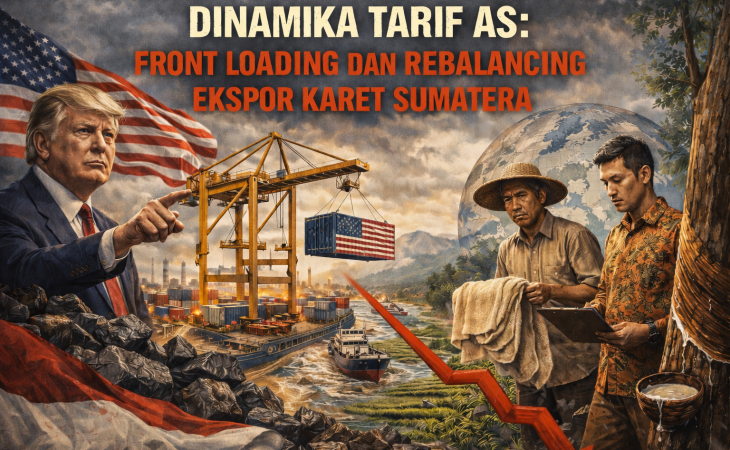 Karet sebagai salah satu komoditas ekspor utama Sumatera, membutuhkan dukungan dalam menjaga daya saing di tengah persaingan global. Daya saing ekspor karet sangat tergantung dari hasil negosiasi tarif 0% dengan Amerika Serikat. Tidak lepas dari ingatan, salah satu dampak dari ketidakpastian kebijakan tarif ini adalah munculnya fenomena front loading pada 2025. Sesuai data ekspor, front loading dari komoditas karet Sumatera terjadi pada periode Januari–Juni 2025 untuk tujuan ke Amerika Serikat. Hal ini sebagai bentuk antisipasi terhadap potensi volatilitas permintaan pasca implementasi kebijakan tarif resiprokal. Pada periode yang sama, kinerja ekspor ke China dan Jepang terpantau melemah. Memasuki Juli 2025, kinerja ekspor karet Sumatera ke Amerika Serikat menurun signifikan, yang mengindikasikan berakhirnya front loading, di tengah kinerja ekspor ke China dan Jepang meningkat tajam. Langkah rebalancing ekspor menjadi opsi dalam menghadapi dinamika tarif resiprokal Amerika Serikat.