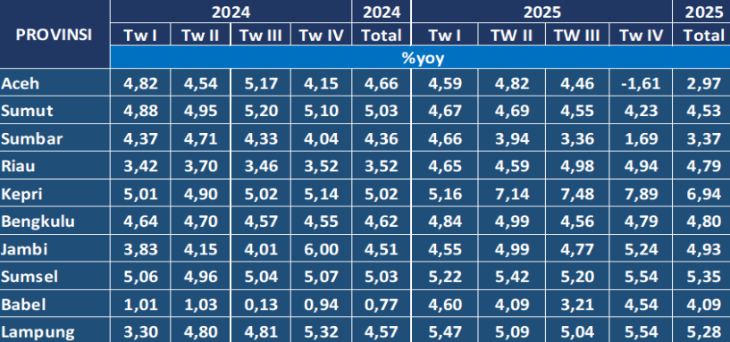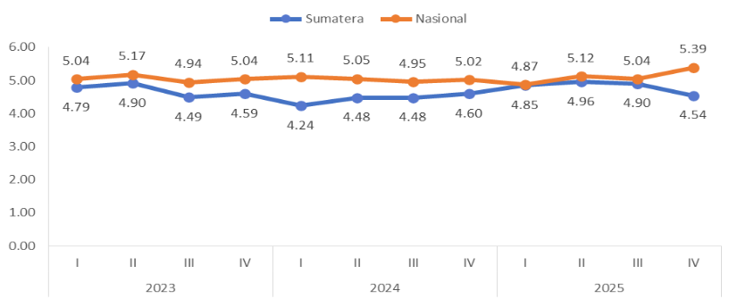 Pertumbuhan ekonomi Sumatera pada Tw IV-25 tercatat sebesar 4,54% (yoy), lebih rendah dibandingkan Tw III-25 (4,90% (yoy). Bencana alam akibat Siklon Senyar di Aceh, Sumatera Utara dan Sumatera Barat berdampak pada perlambatan konsumsi rumah tangga akibat dari hilangnya pendapatan dan tertahannya konsumsi ditengah seasonal HBKN Nataru. Aktivitas investasi bangunan terganggu adanya bencana dan cuaca ekstrem. Konsumsi pemerintah turut tertahan dengan adanya bencana, di tengah ekspansi sejumlah program prioritas pemerintah. Namun, net ekspor tumbuh kuat di atas prakiraan, khususnya dari kinerja migas dengan produksi sumur baru.